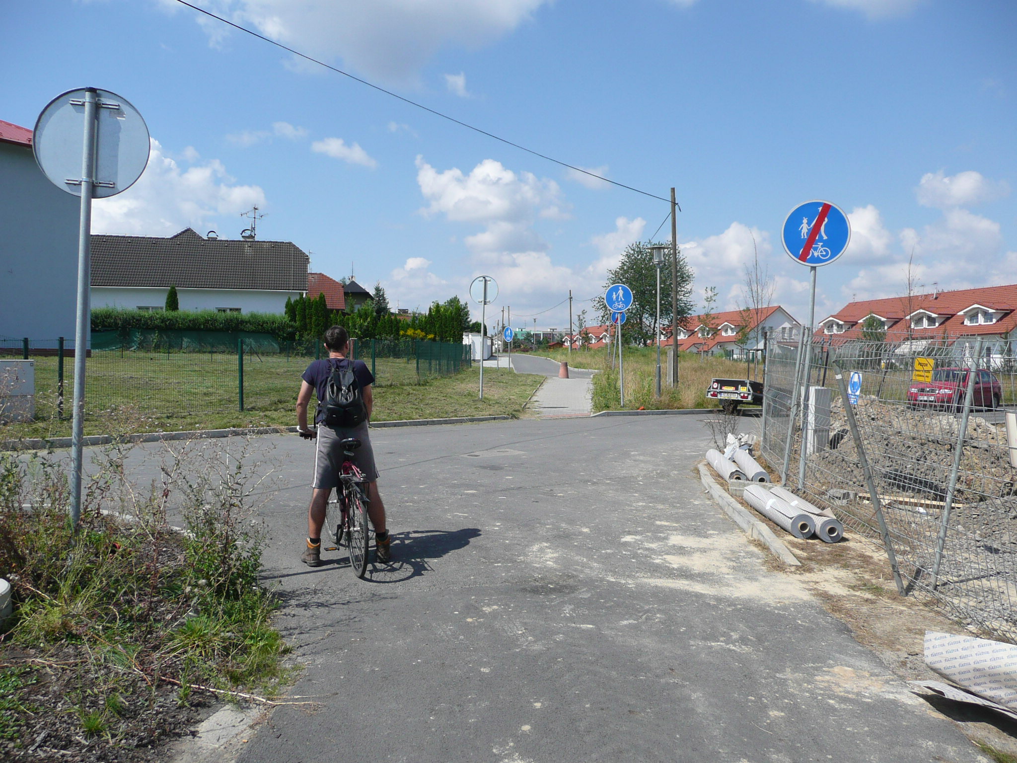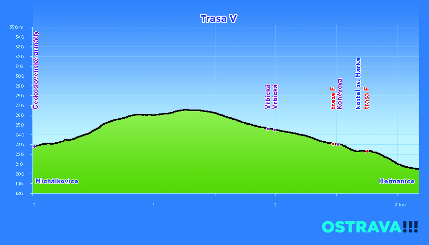 Trasa V je vedena po vozovce ul. Vrbické od prostoru Heřmanických rybníků (začátek v křižovatce s ul. Orlovskou) přes centrum Heřmanic (napojení na trasu F) až na hranici Michálkovic (křižovatka s ul. Košickou). Dokončeno bylo pokračování po ul. Briketářské k bývalé točně autobusů s průchodem po stezce pro chodce a cyklisty k průjezdu pod Báňskou dráhou a dále po trase M po ul. Čs. armády k trolejbusovému obratišti u areálu Průmyslového muzea na dole Michal, ve výhledu se počítá s odbočkou přes Rychvald do Petřvaldu.