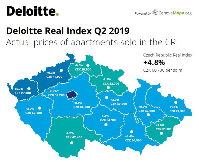 In October, consultants at Deloitte updated the data on the average prices of apartments sold in the Czech Republic. The national average is now 60,700 CZK/m2, and the price index (i.e. the percentage change in the prices of apartments sold compared with the previous quarterly survey) was +4.8 %.