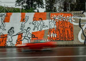 The mural is a loose representation of milestone events in Ostrava’s history – from the Great Kickoff (when the Baník Ostrava football club was founded 100 years ago) as far back as the Big Bang and the emergence of life. A prehistoric family’s amazement when black rocks from the Landek hill caught fire and burned, its warmth attracting people to the area from far and wide. The vision of a better life. Underground explorations. A society blinded by a red flag. The key to a new era, and Ostrava’s present.